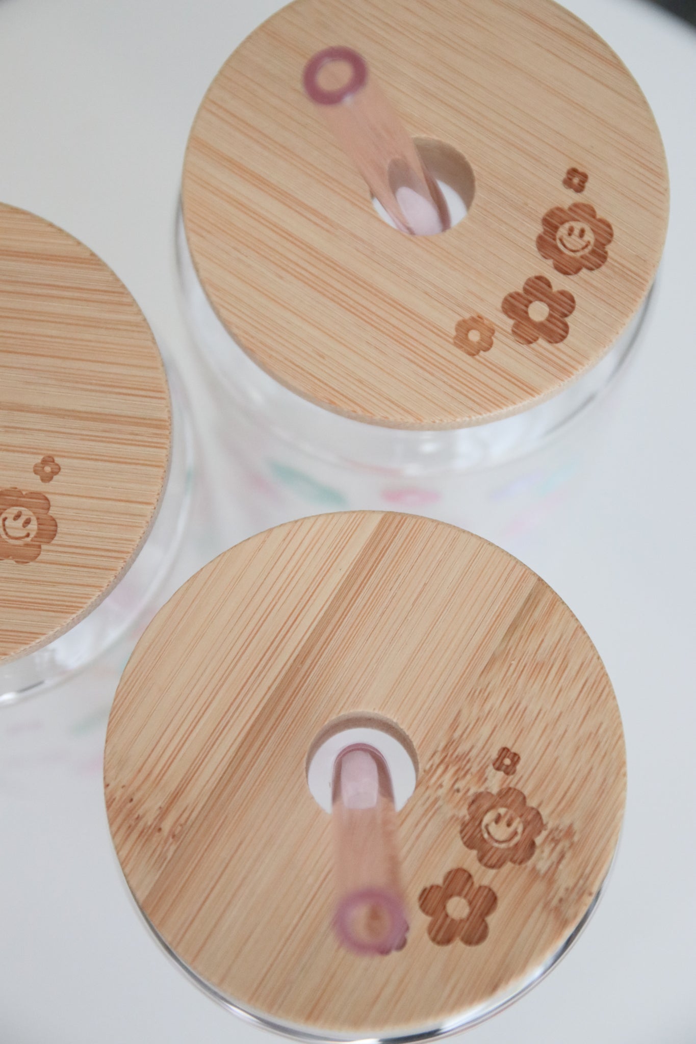 • 18 oz can style glass with bamboo lid and clear glass straw