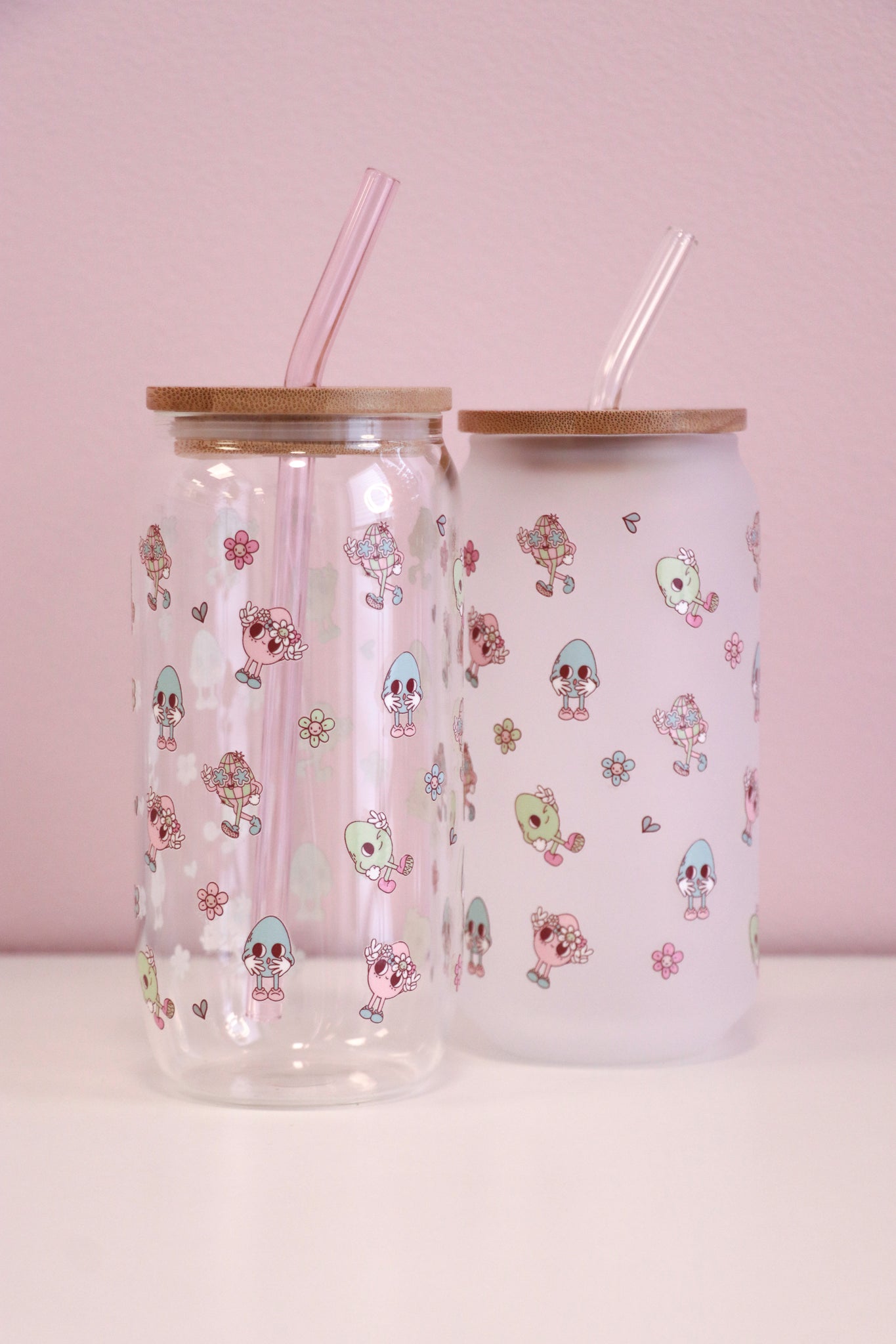 Featuring a custom printed UV-DTF graphic and available in a clear or frosted glass with your choice of pink or clear straw