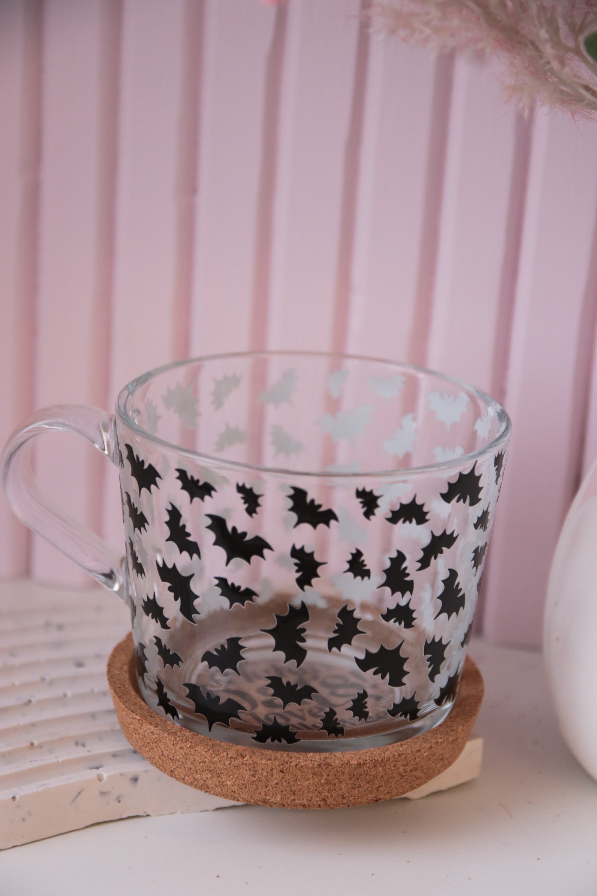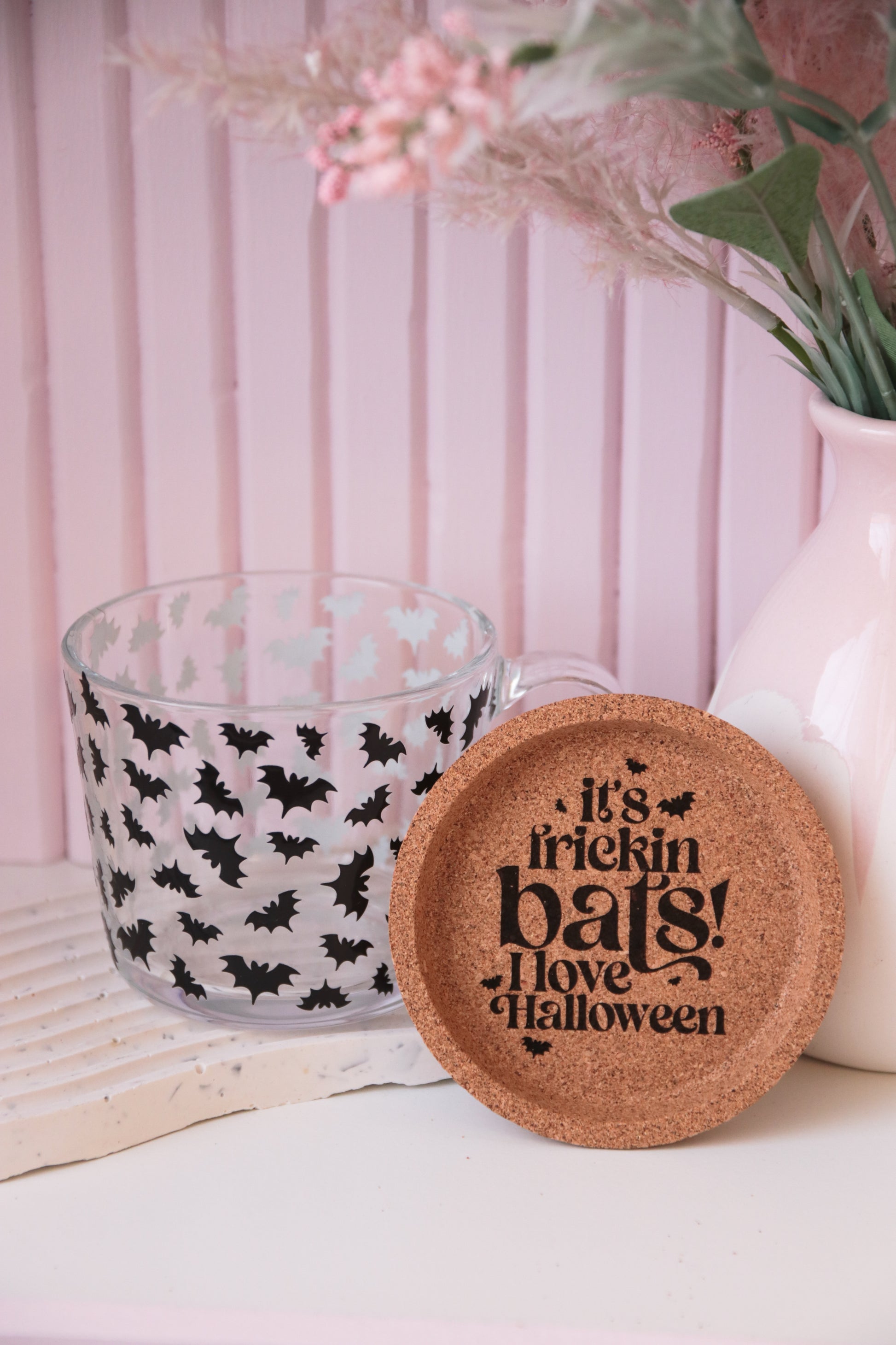 Frickin Bats Glass Mug with Handle and Cork Engraved Coaster