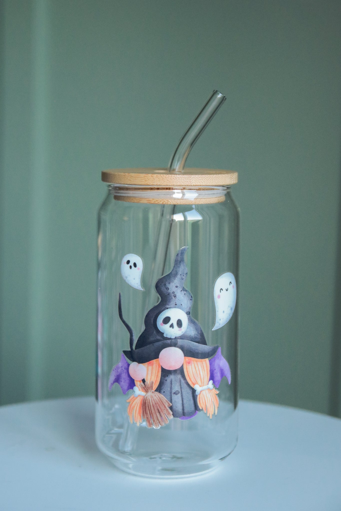 Halloween Gnome Glass with Bamboo Lid and Straw