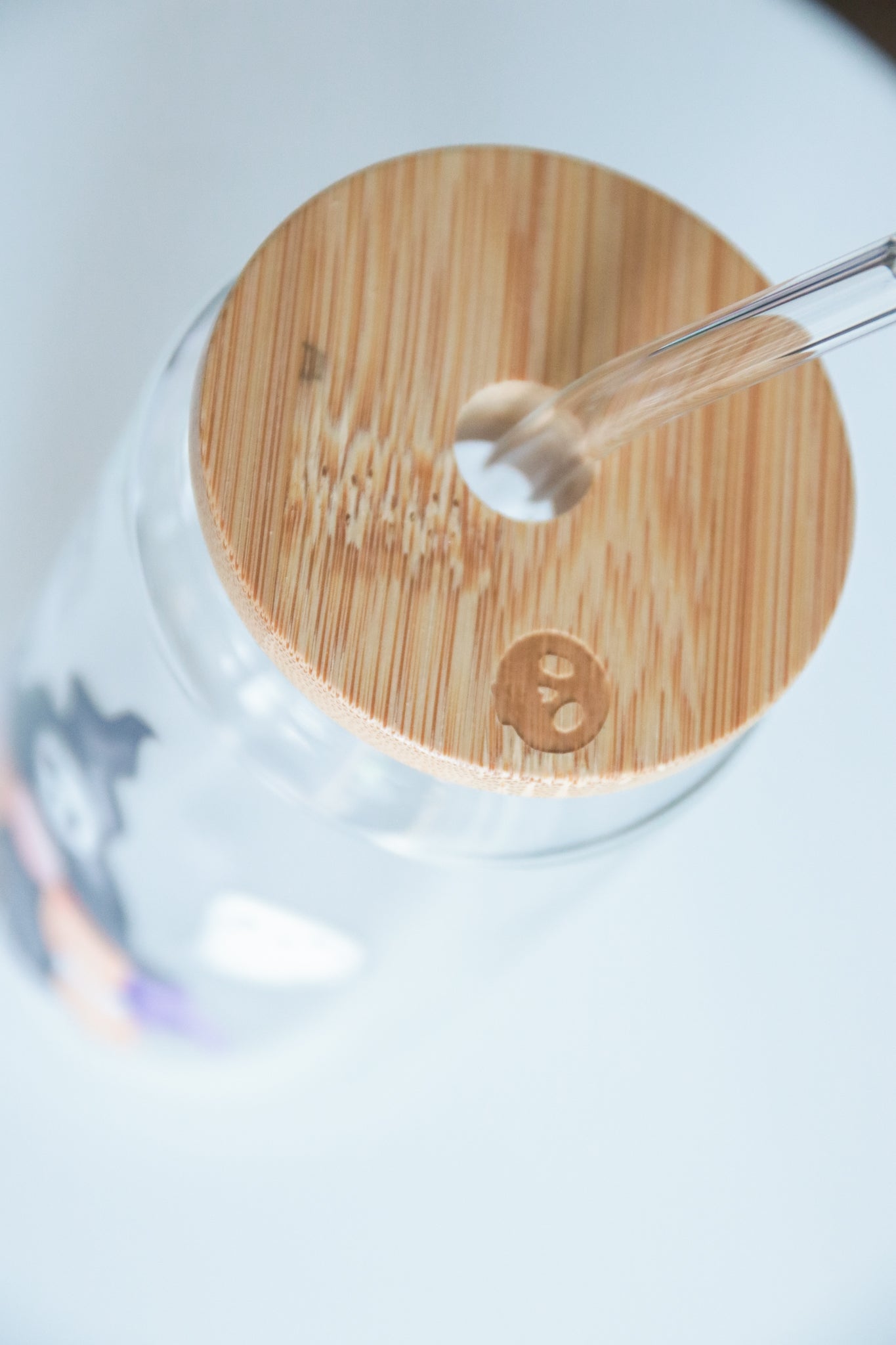 • 18 oz can style glass with bamboo lid and clear glass straw