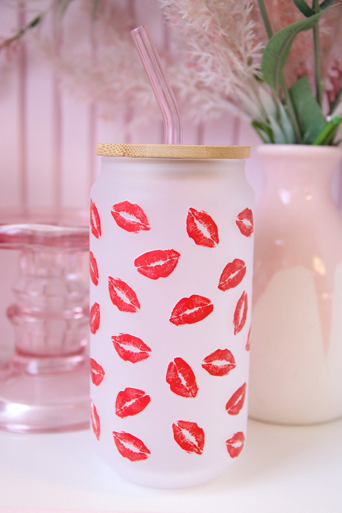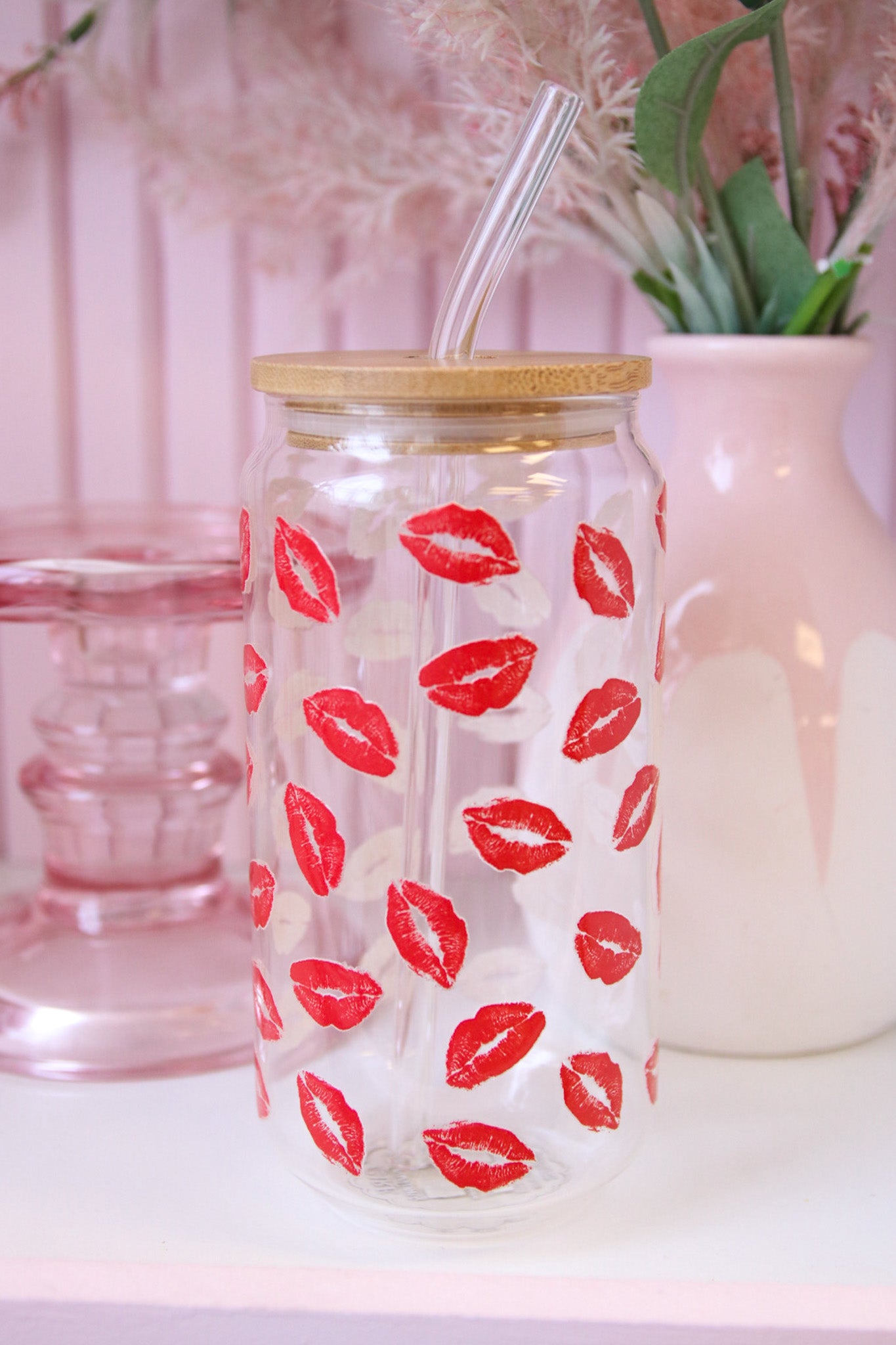 Kisses Can Glass with Bamboo Lid and Straw