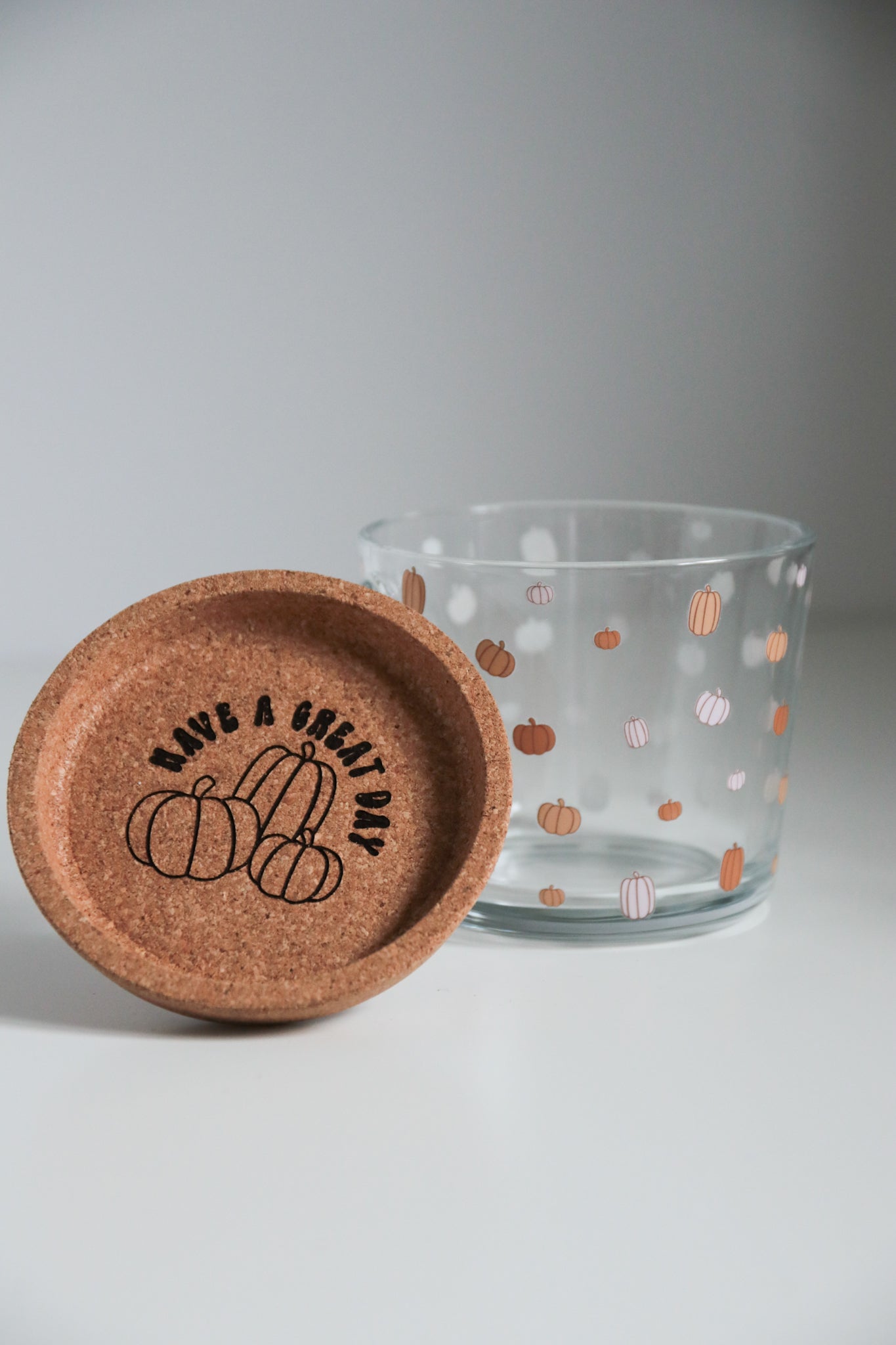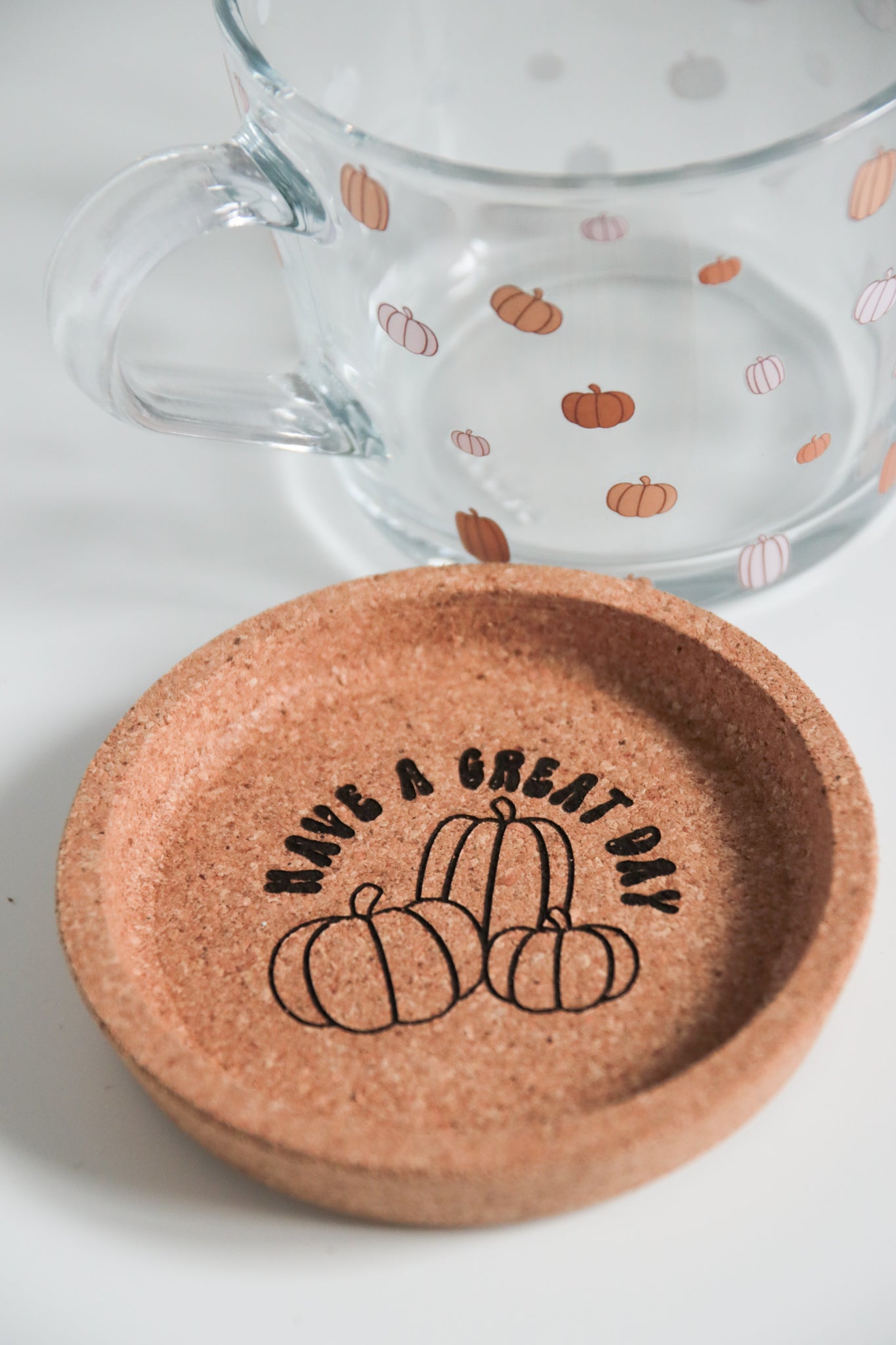 Move over libbey can glasses, my adorable printed glasses with a matching cork coaster are here! The pumpkin glass is perfect for fall mornings with your coffee or tea!